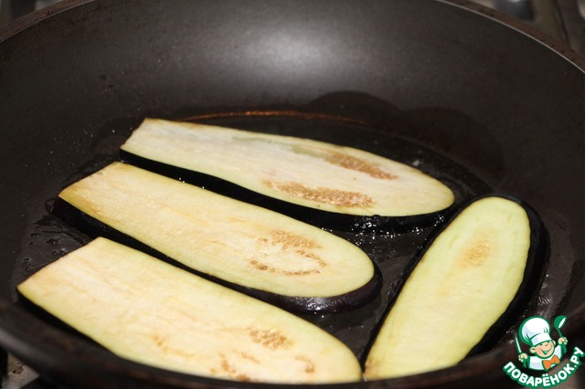 Пока куриная грудка остывает, промытые от соли баклажаны (или 1 шаг пропускаем) быстро обжарить на сильноразогретой сковороде с растительным маслом (2 ст. л.). Готовые пластины баклажан выложить на салфетку для впитывания лишего жира.