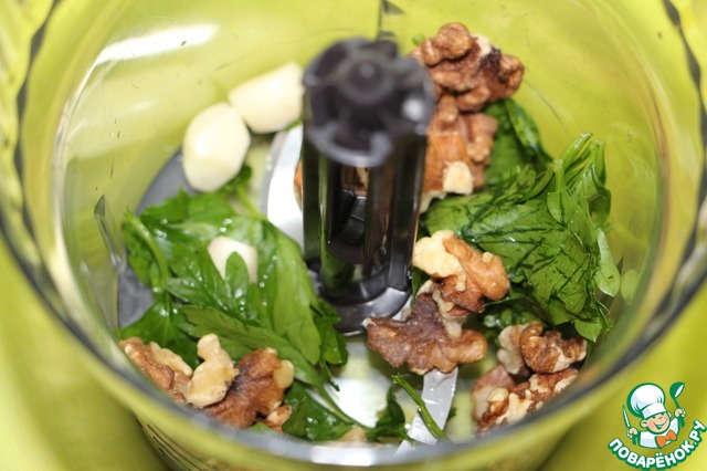 Зелень (та, которую Вы любите), чеснок, грецкие орехи перемолоть в блендере в пасту, постепенно вливая растительное масло столько, чтобы получилась паста, которую можно мазать (не жидкую!). Отрегулировать на соль (учитывая соленость куриной грудки), добавить перец по вкусу.