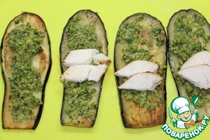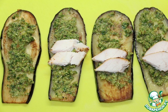 Каждую пластину баклажана намазать полученной пастой, положить по паре ломтиков куриного филе.