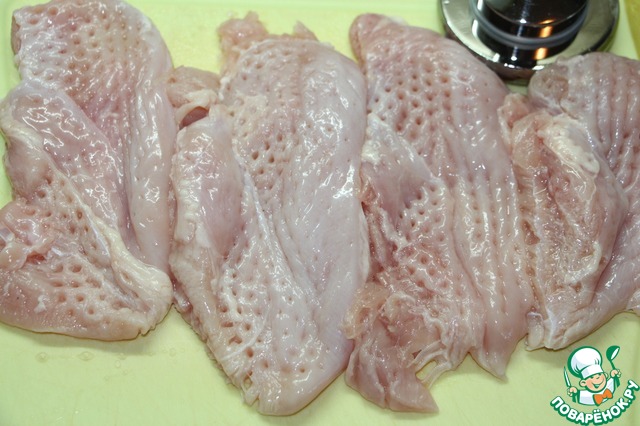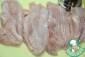 Филе куриных грудок слегка отбить, слишком тонко отбивать не нужно.