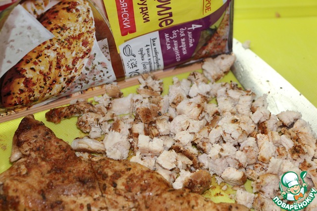 Куриную грудку остудить, нам понадобится одно филе, порезать его мелкими кубиками.