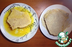 Кусочек обмануть в яйцо, обвалять в сухарях и жарить с двух сторон на среднем огне до золотистой корочки примерно по 2-3 минуты с каждой стороны. -