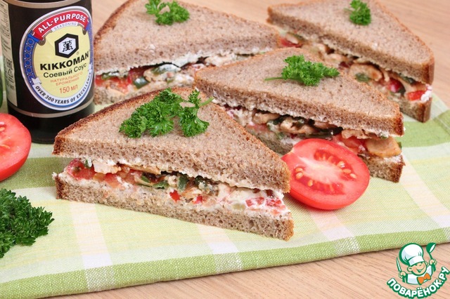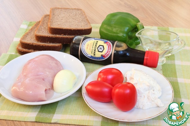 Бывает, что просто некогда сделать полноценный обед или ужин. В этом случае можно быстро соорудить сэндвич или бутерброд. Причем сделать его не просто с сыром и колбасой, а приготовить что-то очень интересное и необычное. Сэндвичи хороши тем, что они удобны для перекуса, спонтанного пикника, "выносного" завтрака. Сегодня я буду делать сэндвич с курицей и помидорами. Ингредиенты совершенно простые, но в сочетании с соевым соусом Киккоман, они превращаются в яркую закуску.