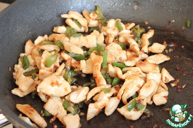 • Перемешиваю и держу на огне еще около 7 минут, до готовности куриного филе. В общей сложности на обжарку у меня ушло 10 минут. Соевый соус должен распределиться по всему филе и овощам, равномерно пропитав их. Снимаю с огня.