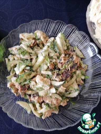 От рецепта старалась не отступать. Но майонез не ем, поэтому заменила на смета и у меня не было зелени, поэтому добавила кунжутные семечки. Получилось очень вкусно. Прекрасный салат , хорош как самостоятельное блюдо.