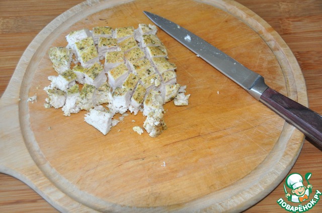 Готовое филе освобождаем от бумаги, даём немного остыть, режем кубиками.