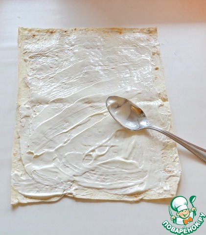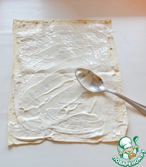 Лист лаваша разверните и смажьте всю поверхность сливочным сыром