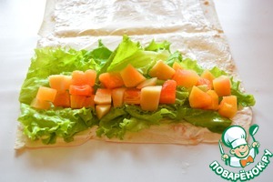 На один край лаваша положите листья салата и кусочки консервированных фруктов