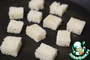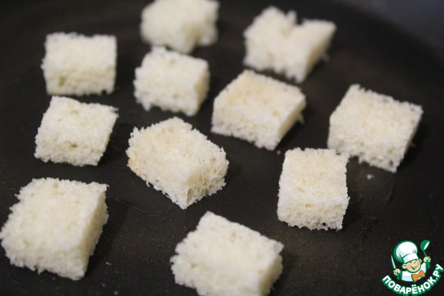 Для сухариков обжарить кусочки батона или хлеба на смазанной оливковым маслом сковороде с двух сторон.