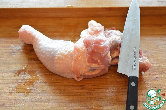 Для того, чтобы снять филе с куриного окорочка нужно соблюдать два правила: 1) использовать тонкий острый нож и 2) не торопиться.