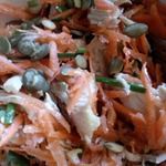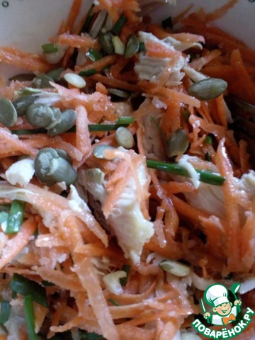 В морковь добавляем тертый чеснок и нарезанную зелень