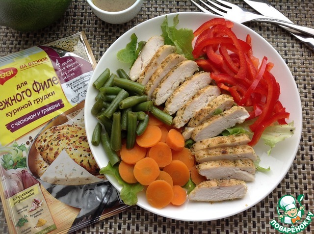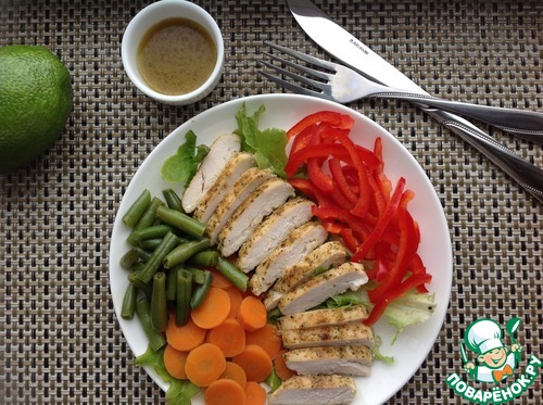 Этот салат понравится в первую очередь поклонникам здорового питания. Сочная нежнейшая куриная грудка, приготовленная без капли масла в ароматных травах от "MAGGI", и хрустящие овощи с пикантной заправкой из оливкового масла с соком лайма - это очень вкусно и полезно. Да и готовить очень легко и просто. Угощайтесь!