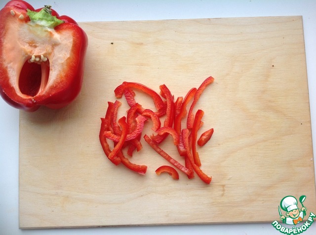 Красный перец помыть, очистить от семянной коробки. Нарезать тонкой соломкой.