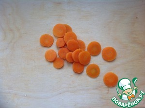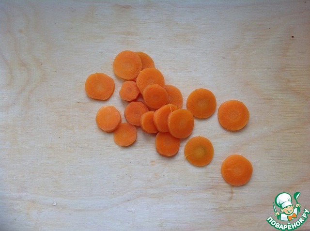 Морковь помыть, очисть от кожицы, нарезать тонкими колечками. При желании можно проблашировать в кипящей воде 5 минут.