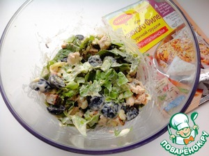 В миску добавить курицу, сельдерей, виноград, листья салата, нарубленные орехи. Перемешать.