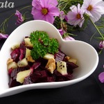 Свеклу хорошо вымыть, отварить. Можно запечь свеклу в кожуре в микроволновой печи или духовке до готовности. Остудить, очистить кожуру и нарезать небольшими кубиками.