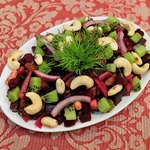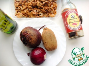 Отвариваю несколько свекол впрок, закупаюсь киви и каждый вечер соединяю 1 свеклу и 2 небольших киви. Не поливаю ничем, киви дает сок, мне его достаточно. Орешки по наличию. И все!