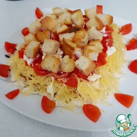 И на сыр выложить нарезанные кубиками помидоры, также немного их посолив и добавив майонеза (заливать все майонезом не надо, только слегка)