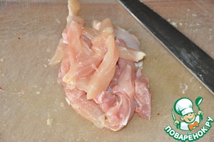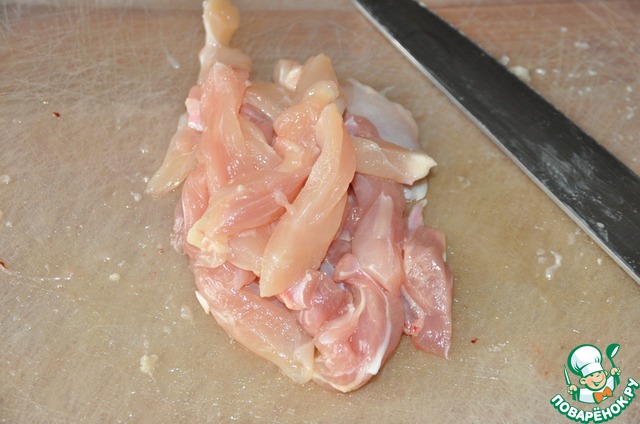 Берём куриное филе. В данном случае не обязательно брать грудку, можно взять более бюджетные бёдра, голени или окорочка. Срезаем филе с костей и режем полосками.