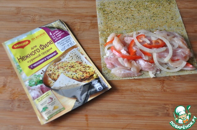 Берём листы MAGGI® На второе для нежного филе куриной грудки c чесноком и травами. В каждой пачке находится 4 промасленных листа с травами, чесноком и солью, больше не требуется никаких добавок.
