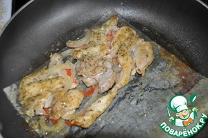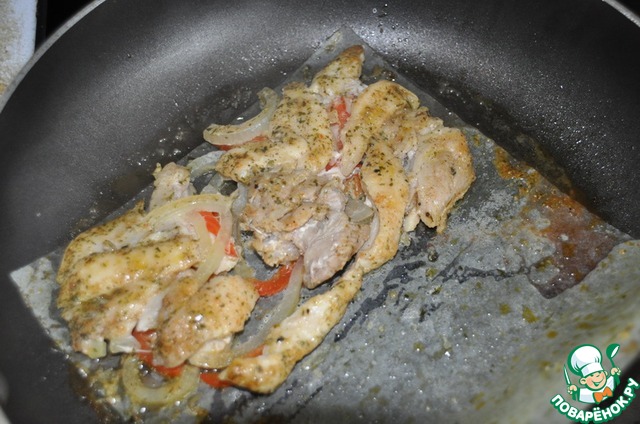 Тонкими полосками режем болгарский перец, лук. По желанию для взрослых кладём измельчённый перец чили. Кладём овощи на лист к курице. В принципе, можно сразу смешать курицу с овощами и положить на лист.