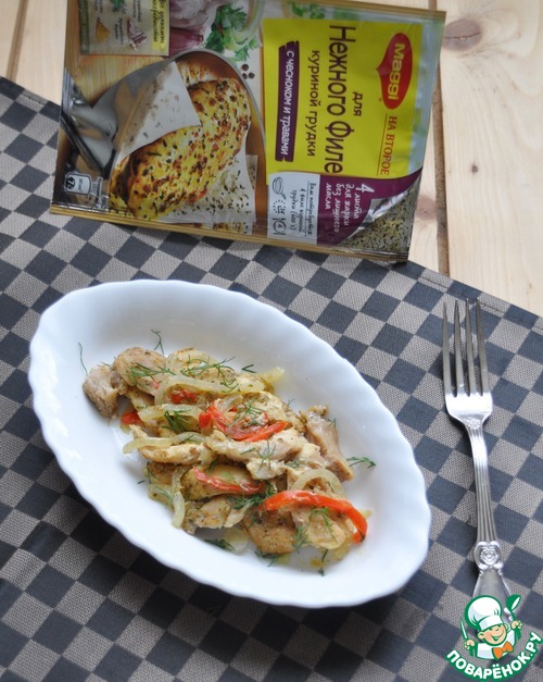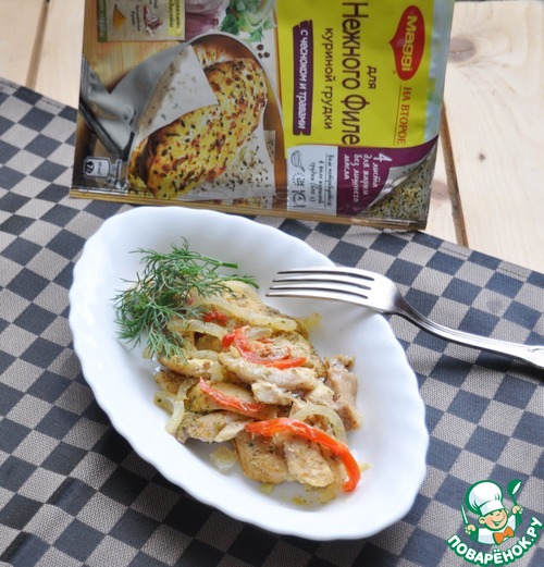 Прошу не бросать в меня тапками! Рецепт прост до примитива и рассчитан на ленивую хозяйку, или на занятую бизнесвумен, или на начинающего поварёнка. Недавно я открыла для себя приправу MAGGI® "На второе для нежного филе куриной грудки c чесноком и травами". Готовить с ней - одно удовольствие: быстро, просто, диетично. Эту закуску можно подать, как горячей, так и холодной. Готовится очень быстро, поэтому можно подать неожиданным гостям.
