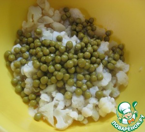 В миске соединяем маленькие соцветия цветной капусты, зеленый горошек.
