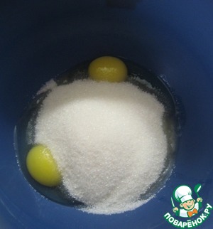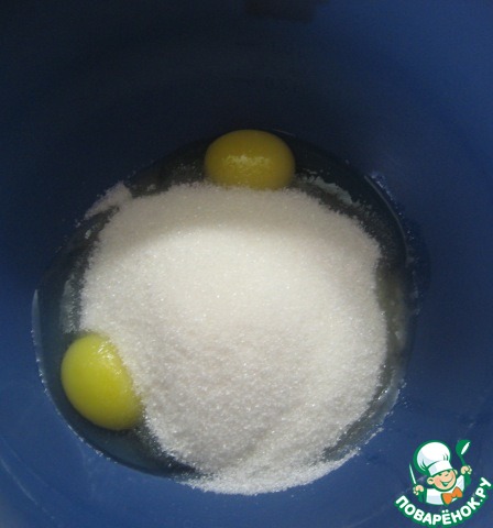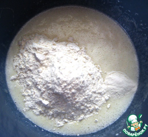 Добавить муку, щепотку соли и разрыхлитель теста.