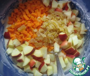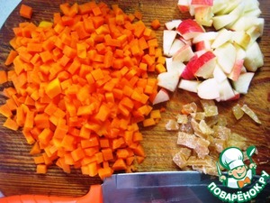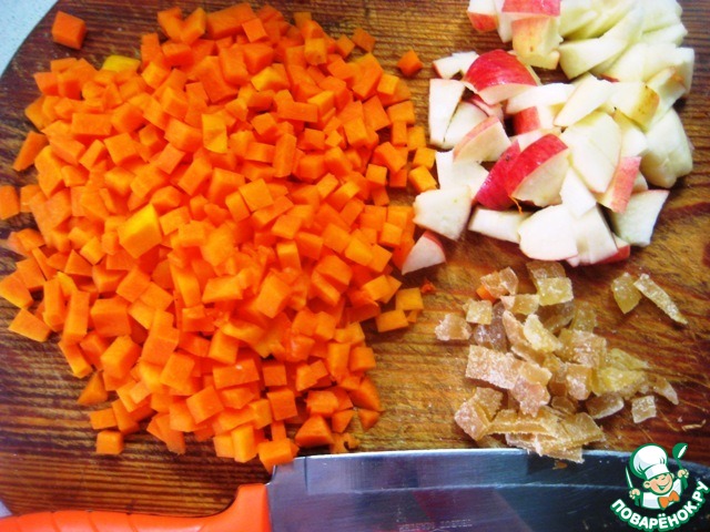 Свежую тыкву и засахаренный имбирь нарезать мелким кубиком, яблоки - небольшими кусочками.