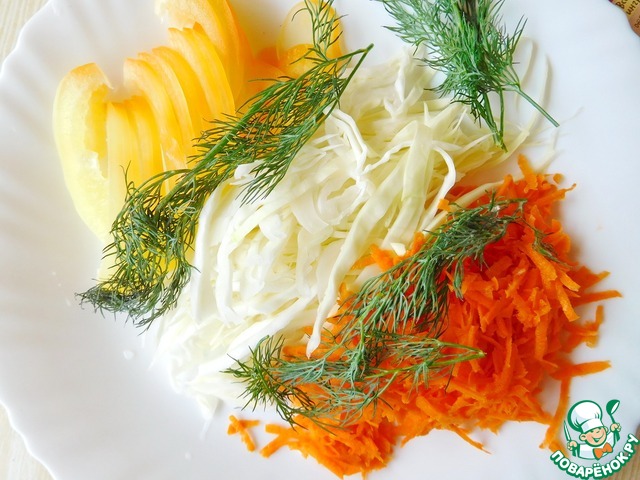 Нарезанные овощи слегка посолить, обмять руками и выложить на тарелку, сформировав "подушку".