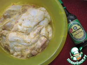 Курицу хорошо обмазать маринадом, емкость с мясом накрыть и поставить в холодильник на 3-5 часов. -