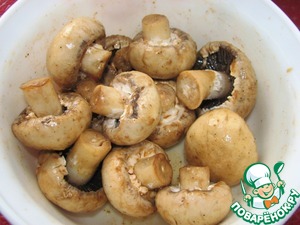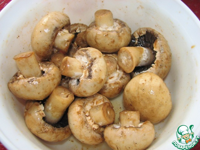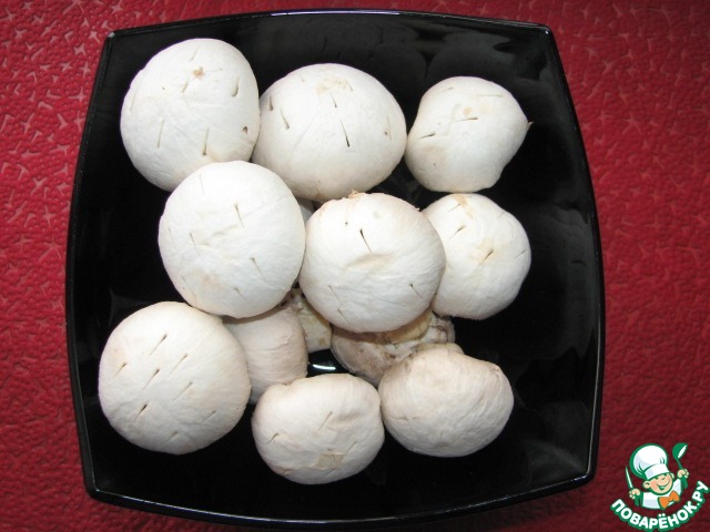 С шампиньонов снять кожицу, ножом наколоть шляпки в нескольких местах.