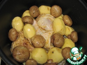 В чашу мультиварки выложить курицу, сверху грибы и картофель. Влить 0,5 ст. питьевой воды и полить оставшимся от грибов маринадом. Посолить по вкусу.