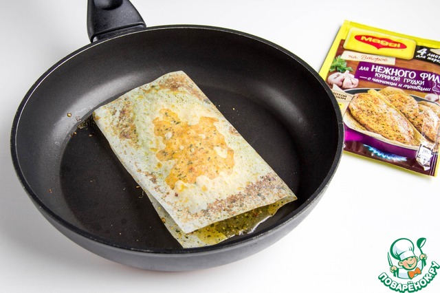 Куриное филе слегка отбить. Не сильно, примерно до 2-3 см. в толщину. Положить филе в лист со специями MAGGI® На второе для нежного филе куриной грудки
