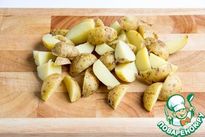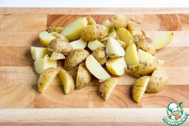 Картофель помыть и отварить в мундире до готовности. Остудить и наразеть четвертинками