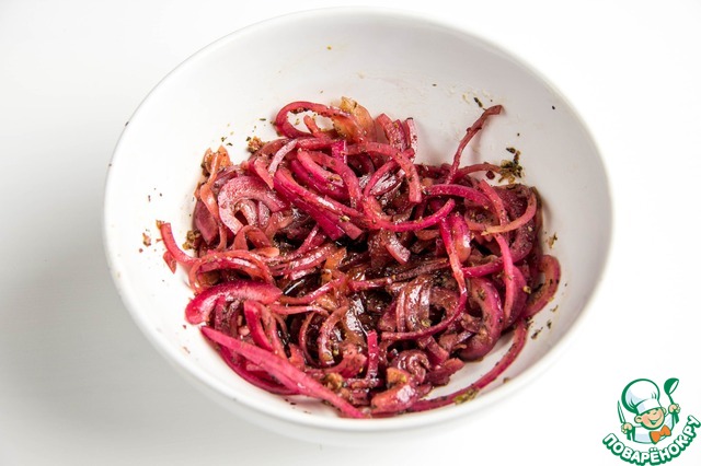 Лук нарезать тонкими полукольцами. В миске смешать оливковое масло, соевый соус, бальзамический уксус, сушеные травы, чеснок, выдавленный через пресс. Положить в миску лук и мариновать его около 30-60 минут