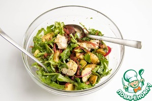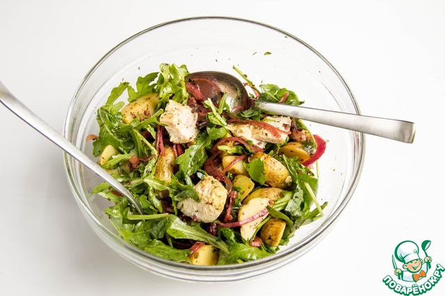 В миске смешать картофель, рукколу, маринованный лук вместе с маринадом, который станет заправкой для салата.