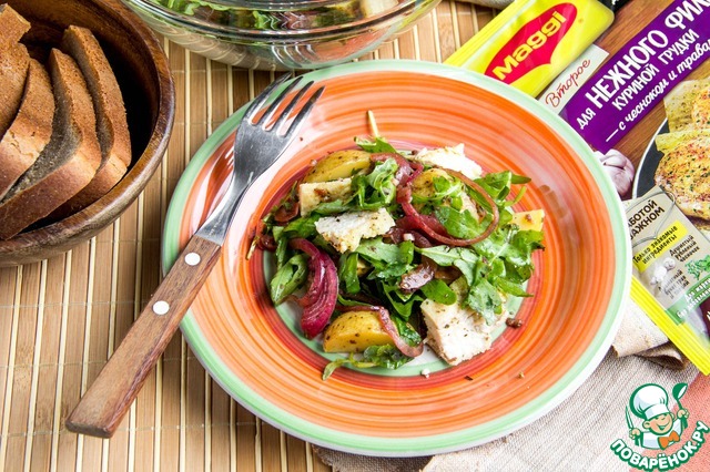 Куриное филе одно самых частых продуктов в моём рационе. Оно богато белком, при этом не жирное и имеет мало калорий. А с помощью листов MAGGI его можно вкусно приготовить без капли масла. Такая курица отлично подходит для салатов. Хочу поделиться с вами одним из вариантов. Изюминка этого салата - вкусное филе и маринованный лук.