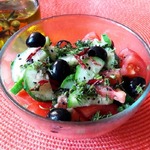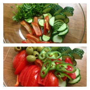 Перец болгарский нарезать небольшими тонкими полосками. Петрушку мелко нарезать, огурцы нашинковать половинками. Помидоры черри нарезать половинками, у меня дамские пальчики, я нарезала их на слайсы. Острый перец ( я от семян не очищала) нарезать тонкими слайсами, добавить оливки.