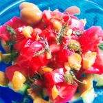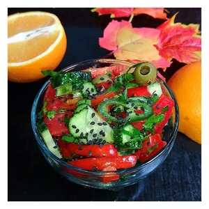 Вкусный, сочный, острый, овощной салатик! Все понятно и знакомо, но немного новых ингредиентов и оригинальной заправки, и салат звучит по новому! Свежо, пикантно, ярко! Угощайтесь!
