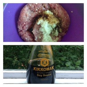 • В фарш добавляем соевый соус, чеснок, пропущенный через пресс, и луковицу, натертую на крупной терке. Вымесить фарш.