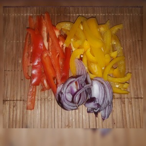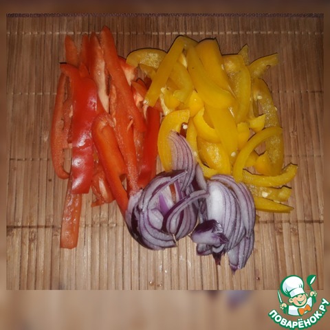 Тем временем, нарезать соломкой перец и лук. В оригинальном рецепте, еще требуется жгучий перец. В моем он отсутствует. Овощи запечь на гриле или в духовке.