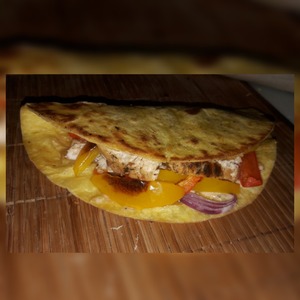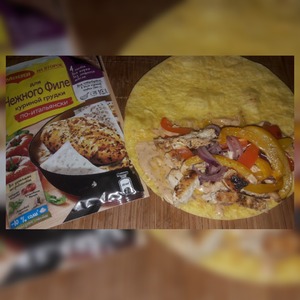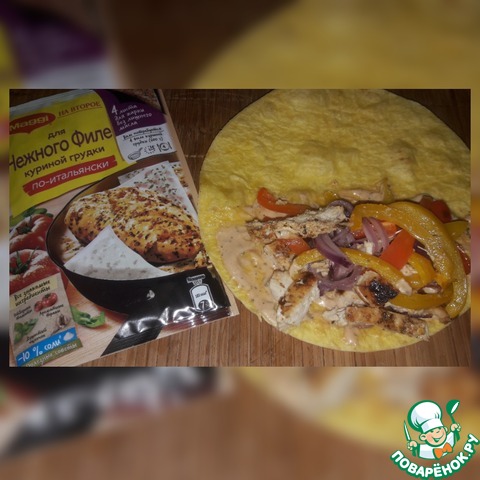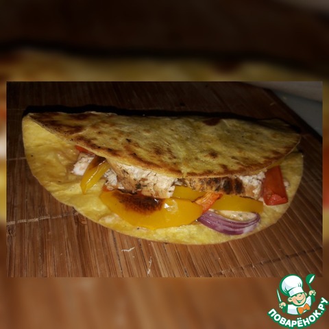 Приготовить соус для мексиканской лепешки. У меня это острый кетчуп и майонез. Намазать лепешку и выложить на нее готовые овощи и порезанную куринную грудку.