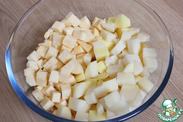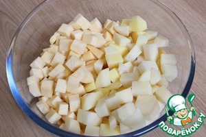 Картофель и репу режу небольшими кубиками. Добавляю к ним 1 чайную ложку соли и перемешиваю.
