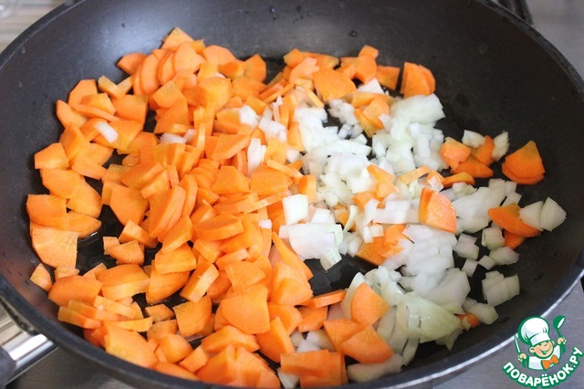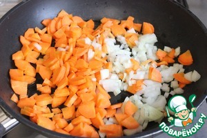 Лук мелко режу. Морковь нарезаю небольшими треугольничками. В разогретую сковороду вливаю растительное масло, кладу морковь и лук, обжариваю 1-2 минуты.