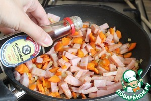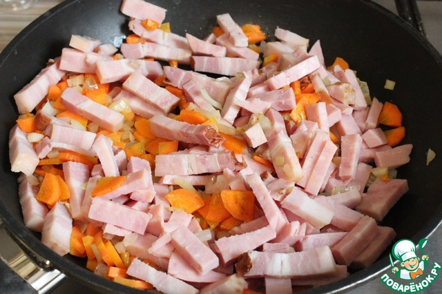 Добавляю в сковороду нарезанную соломкой ветчину и грудинку.