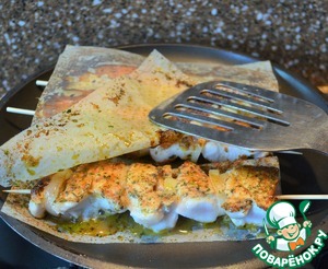 Кусочки нанизать на деревянные шпажки, чередуя с луком.