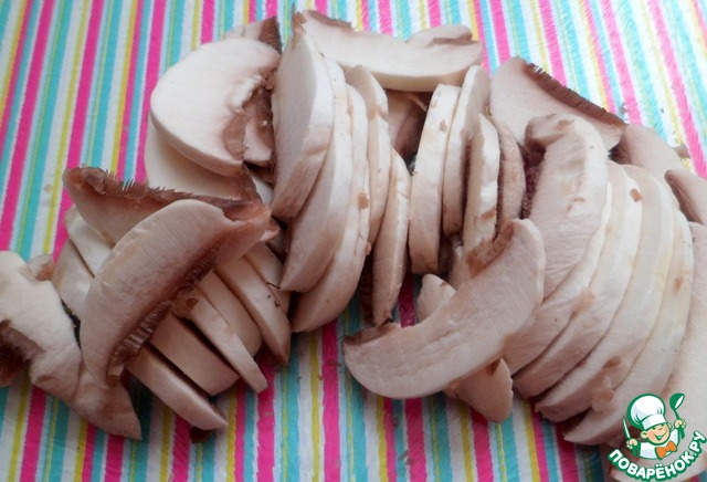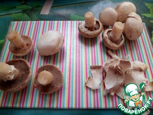 Ножки удалить, они пригодятся для жарки в другое блюдо, заморозьте их. Нам нужны шляпки, их нужно нарезать пластиками.