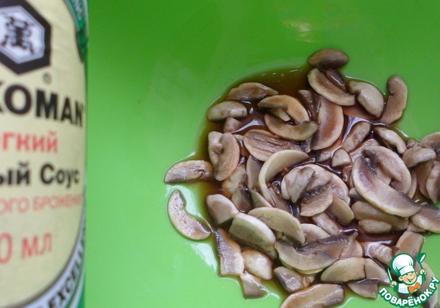 Через пару минут, как только грибы слегка обсохнут в дуршлаге, переложить их в мисочку и залить 1 ст. л. соевого соуса ТМ Киккоман -легкий, отставить.