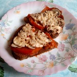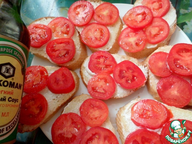 Собираем наши бутерброды. Смазать кусочки багета тонким слоем майонеза или сливочного масла. Помидоры нарезать тонкими кружками, разложить сверху. Помидоры хорошо взять сорта "сливка", в них меньше сока. Кисточкой, смазать помидоры соевым соусом ТМ Киккоман -легкий из мисочки, где маринуются грибы.
